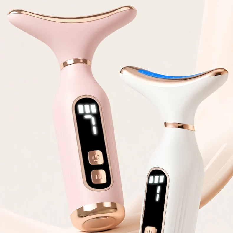 The EMS Vibration Face Massager is a multifunctional beauty device designed to firm, tone, and revitalize facial skin. Combining constant-temperature vibration massage with seven-color LED light therapy, it promotes blood circulation, boosts collagen production, enhances skin elasticity, and helps reduce puffiness. Its dolphin-shaped ergonomic design fits comfortably around the neck and face, offering a 160° contour for safe, precise, and relaxing use. With seven modes and three intensity levels, it delivers a customizable spa-like treatment at home.